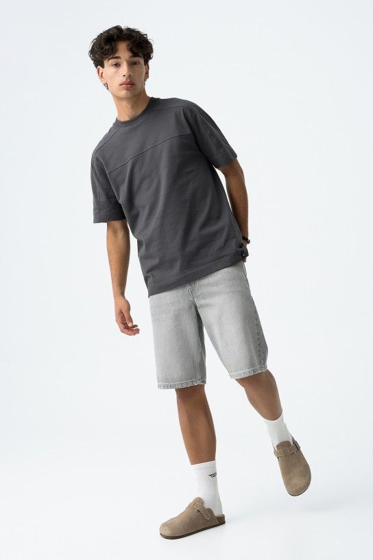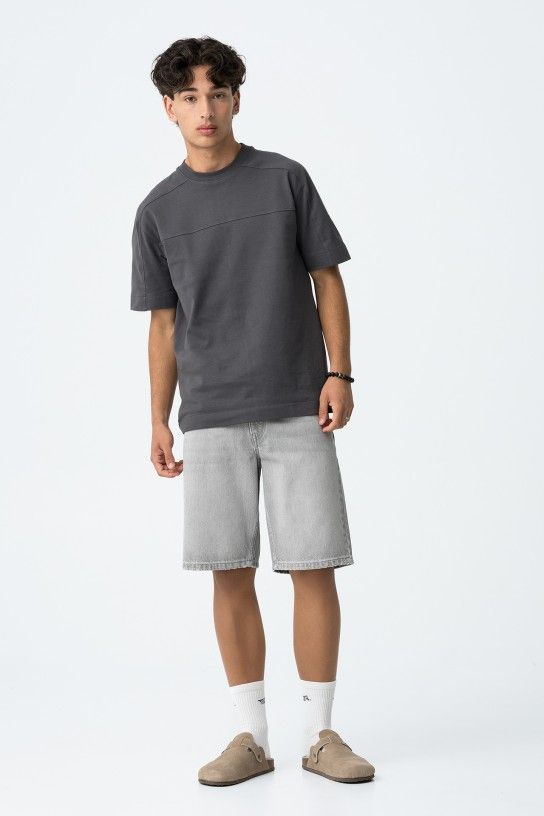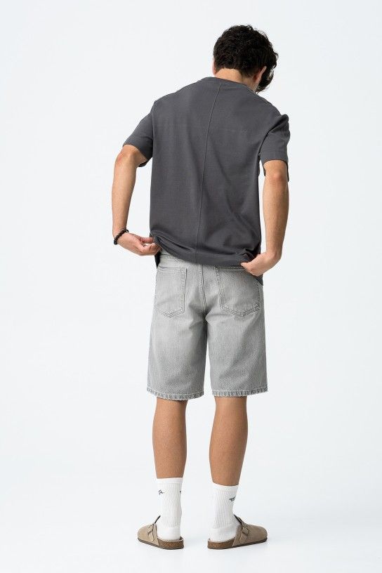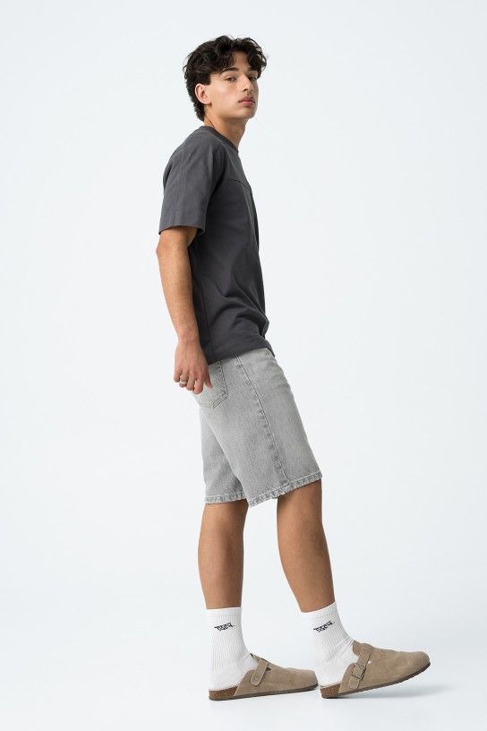 Calções denim wde com cinco bolsos. Fecho zip frontal e botão metálico.