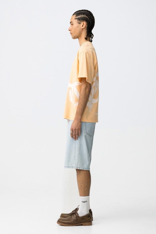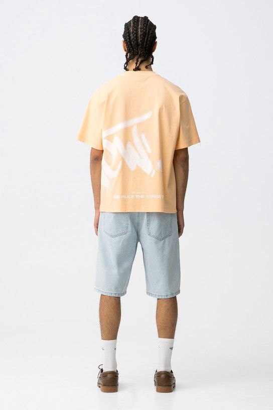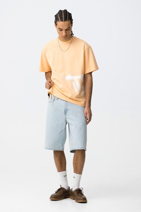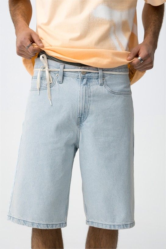 Calções de ganga em azul claro, corte largo, bolsos à frente e atrás, vibe casual e descontraída.
