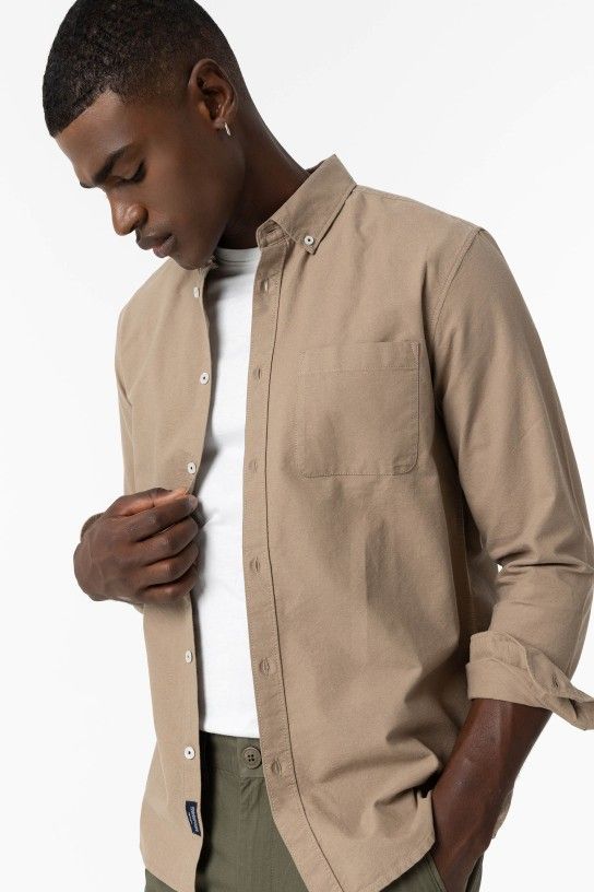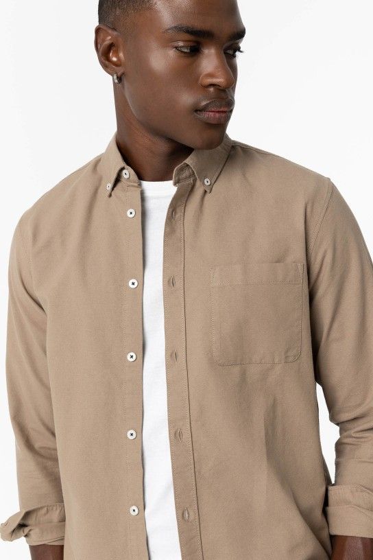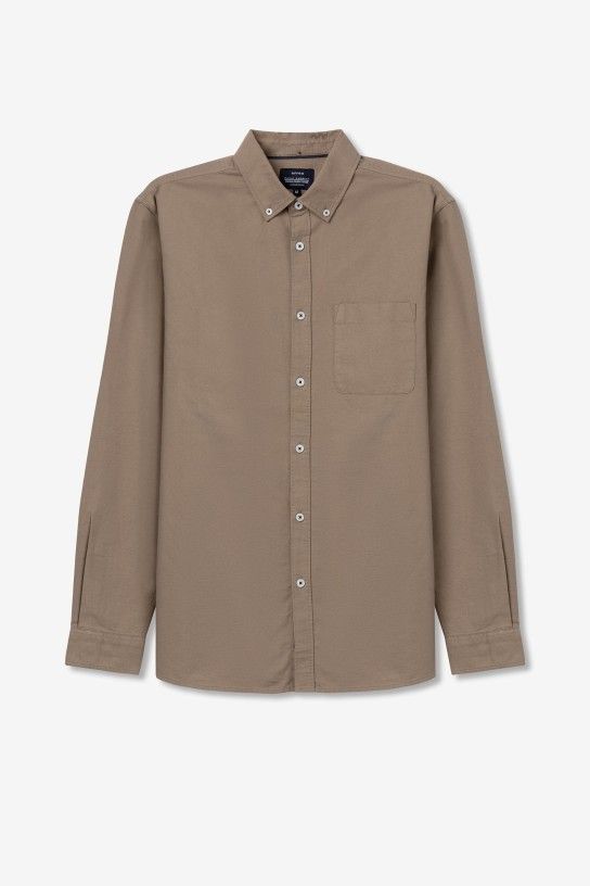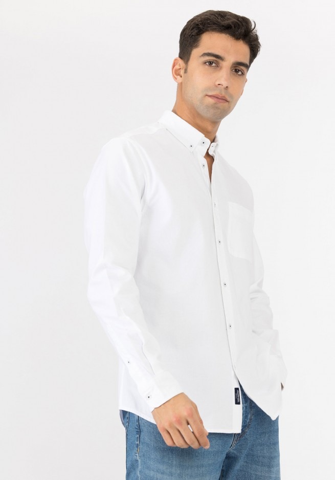 Camisa com colarinho de aba com botões e manga comprida. Fecho frontal de botões. Bolso à frente.