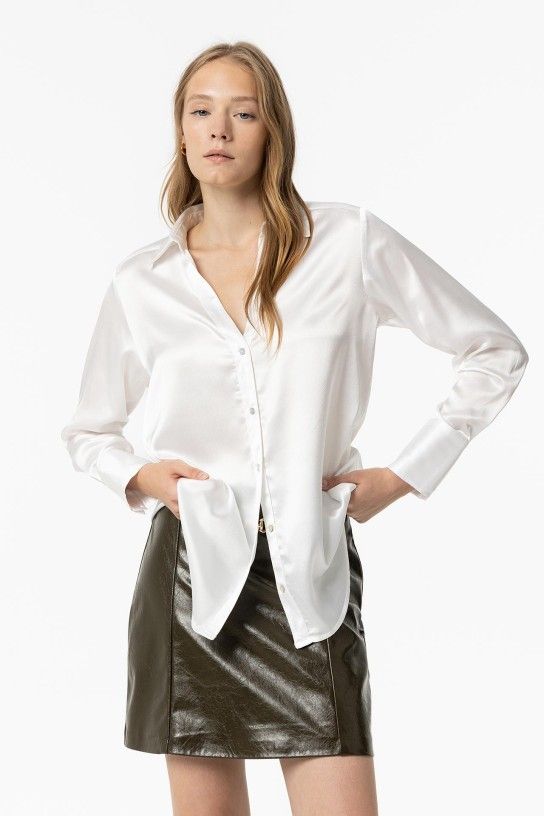 Camisa acetinada, com abertura frontal e fecho de botão de madrepérola. Colarinho com decote em v, manga longa, com ajuste de botão nos pulsos e bainha curva.
