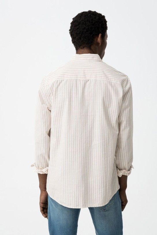 Camisa com colarinho de aba com botões e manga comprida. Bolso à frente. Fecho frontal com botões.