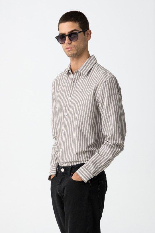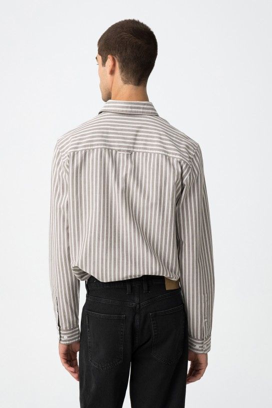 Camisa regular fit de algodão às riscas, com fecho de botões frontal, gola com colarinho, manga longa com botões nos punhos e bainha curva.
