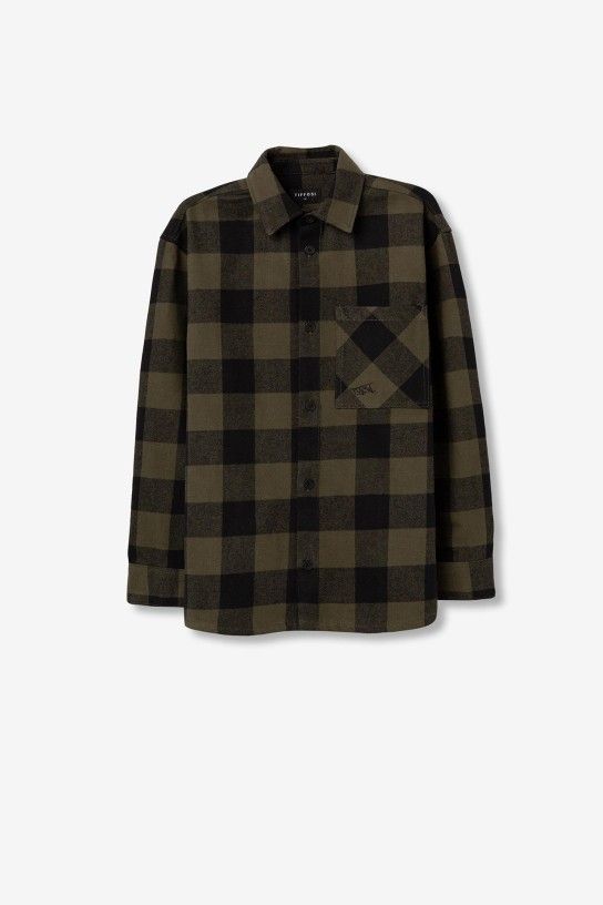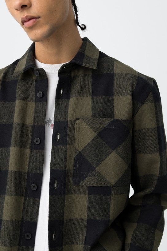 Camisa de manga comprida em flanela xadrez. Bolso frontal no peito esquerdo. Gola clássica e fecho de botões. Bainha arredondada.