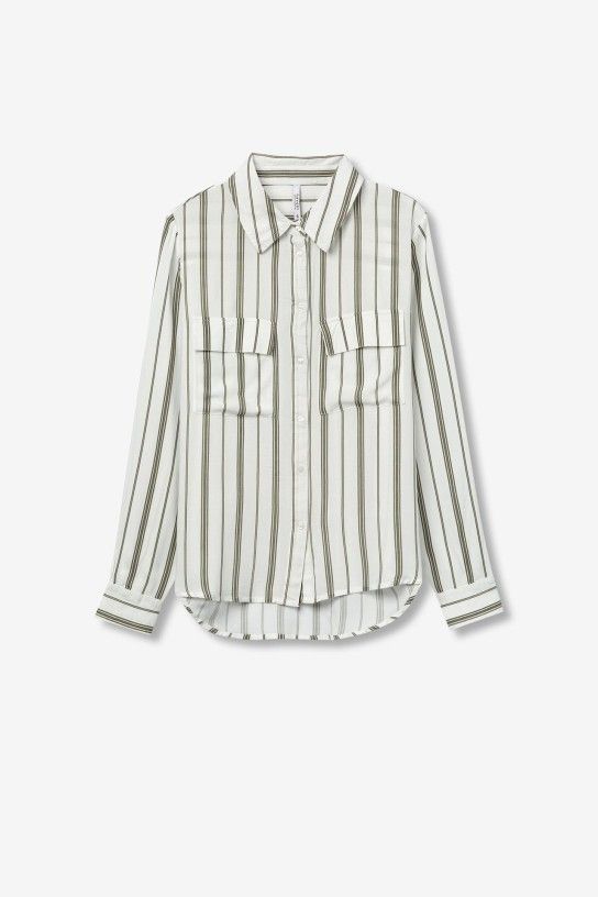 Camisa regular fit às riscas com dois bolsos de pala frontais e fecho de botão. Colarinho, manga longa com botões nos punhos e bainha assimétrica curva.