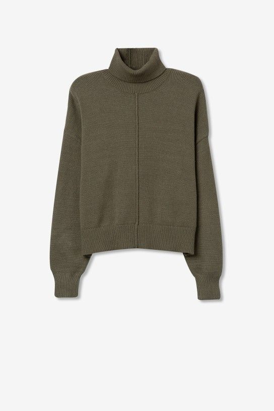 Camisola relaxed fit com costura frontal, gola alta, manga longa e terminações caneladas.