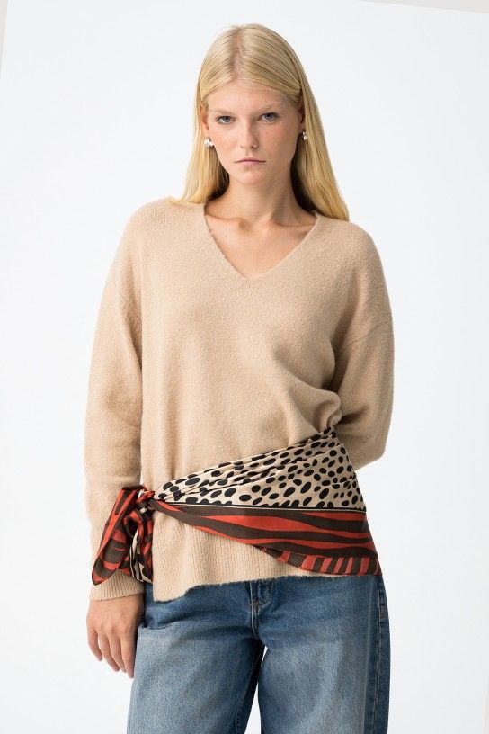 Camisola relaxed fit com decote em V, manga longa, bainha assimétrica com fendas laterais e terminações em ponto canelado.