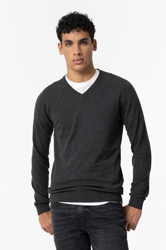 Camisola de manga comprida com decote em V. Gola, punhos e bainha em rib. Corte regular fit. Malha suave.