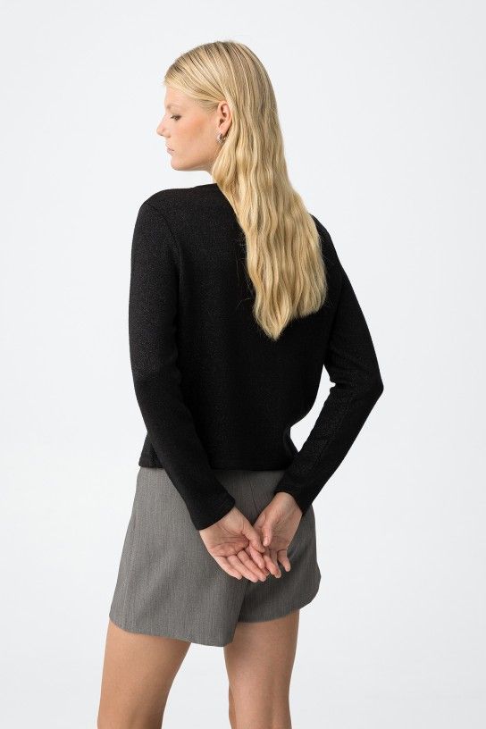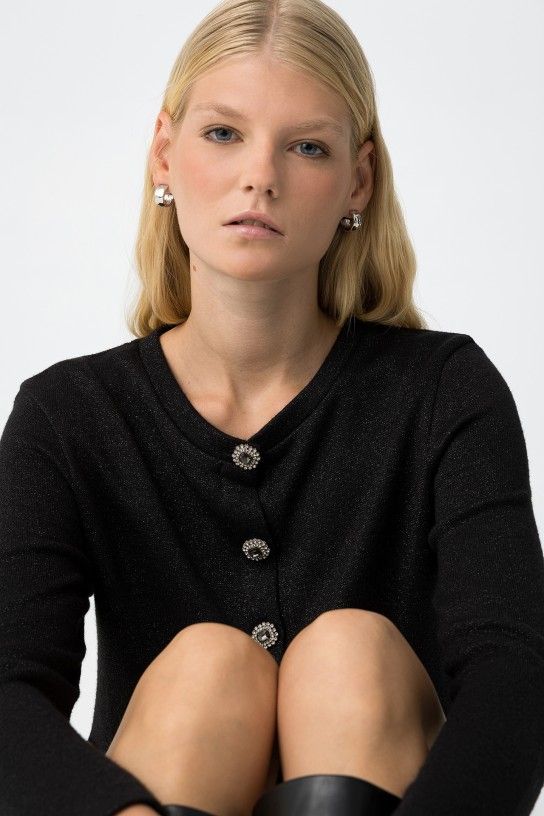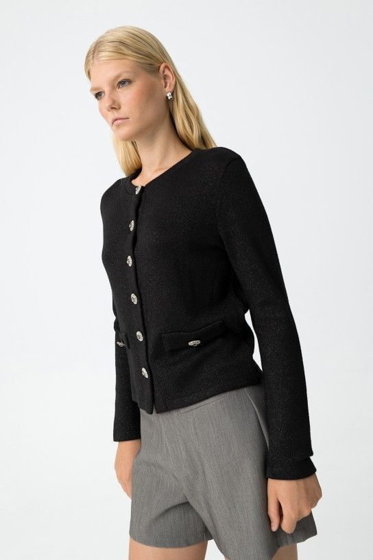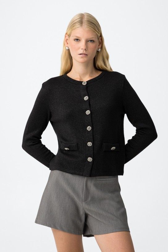 Cardigan regular fit com fio metálico inserido, palas decorativas e aplicações de joias. Decote redondo, fecho de botão e manga longa.