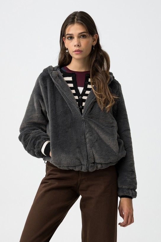 Casaco regular fit de pelo sintético com dois bolsos, capuz, fecho de alternância e manga longa.