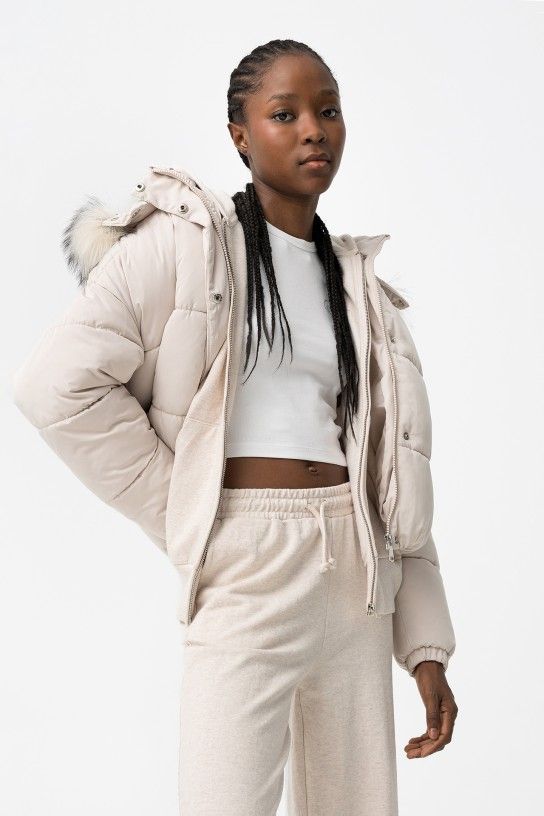 Casaco oversized acolchoado com dois bolsos frontais, capuz removível com pelo sintético e fecho de correr. Gola alta com botões de pressão, manga longa