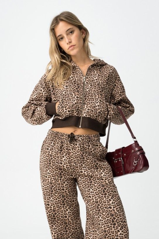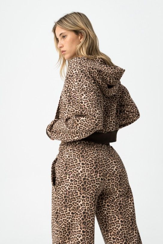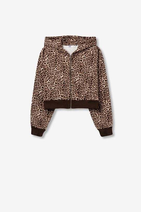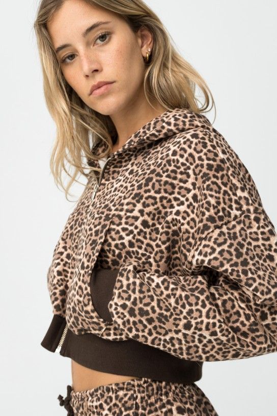 Casaco relaxed fit de malha, com estampado de leopardo e fecho de correr frontal. Capuz, manga longa, bolso frontal e bainha cropped. Interior cardado.