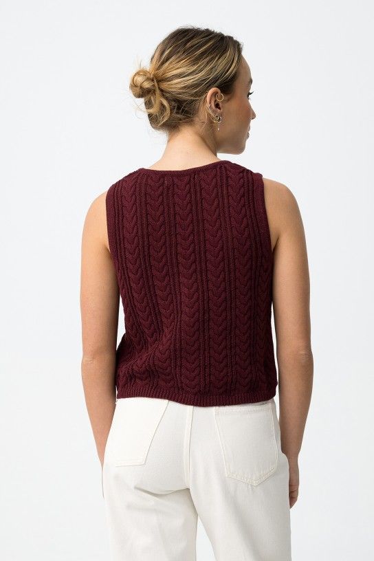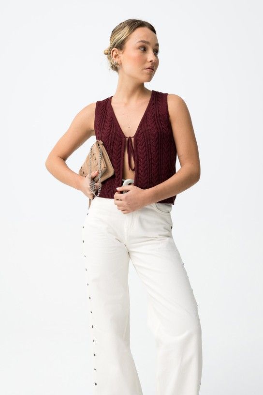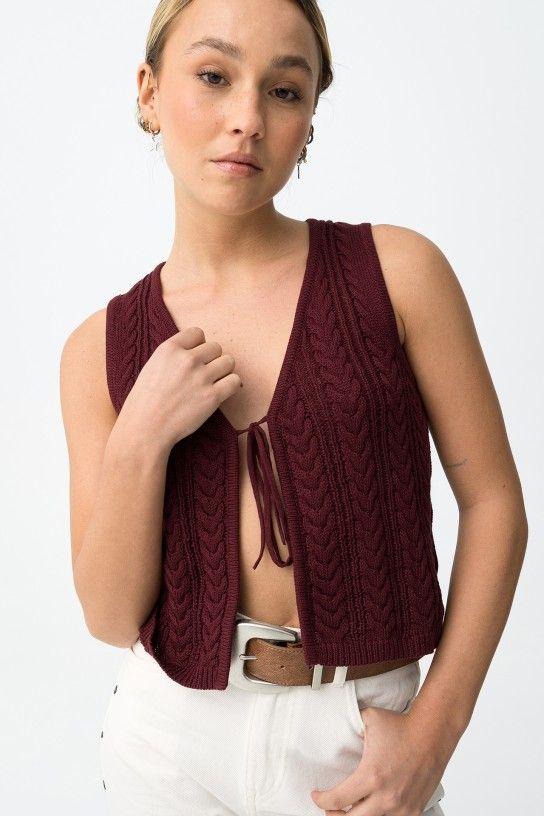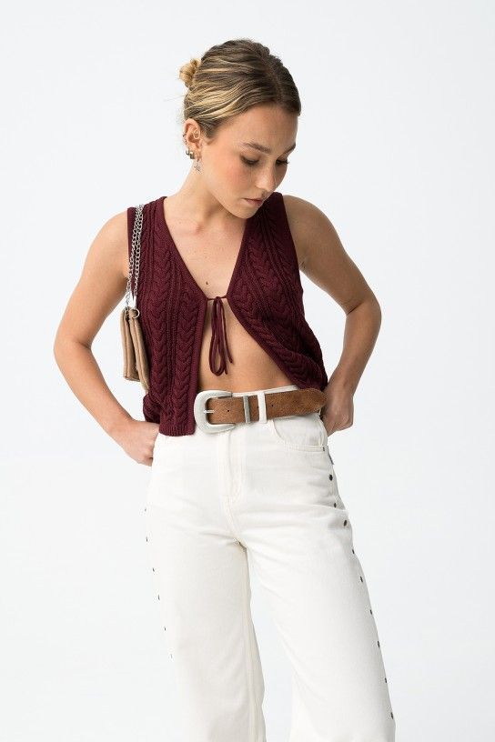 Camisola sem mangas com padrão entrançado, corte cropped e laço frontal, vibe casual chic.