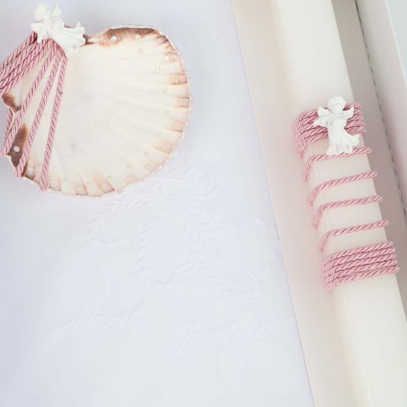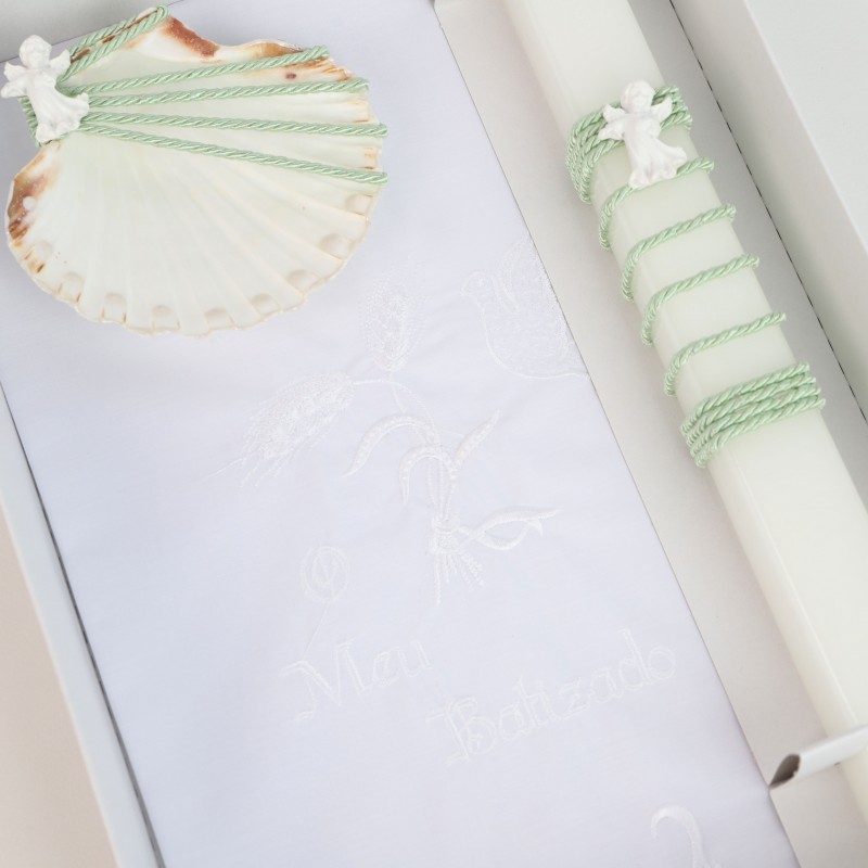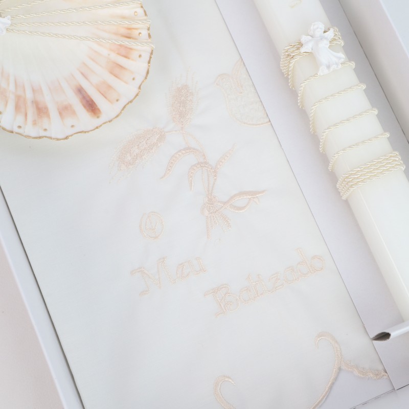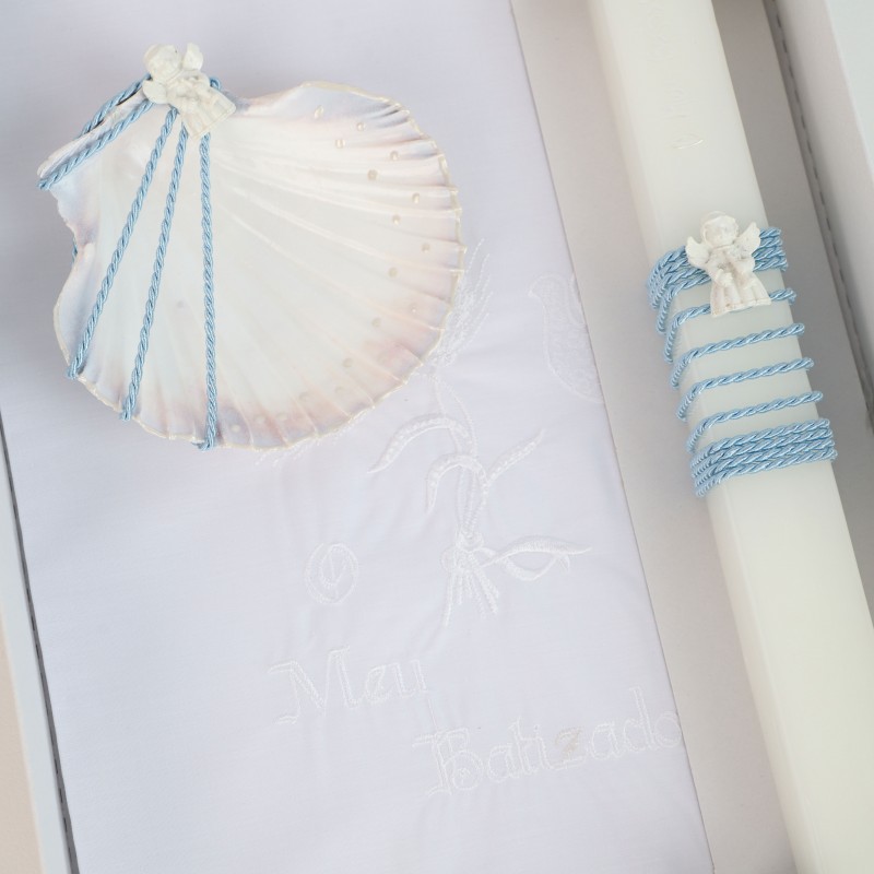Conjunto de Acessórios para Batismo: Toalha Bordada, Concha e Vela com Aplicações.