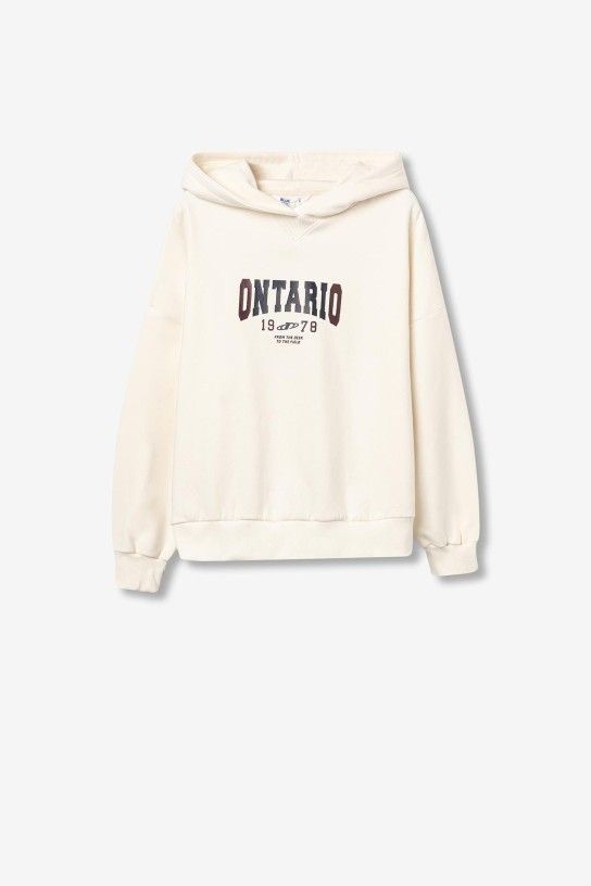 Hoodie oversized com estampado frontal, capuz e manga longa. Terminações caneladas e interior cardado.