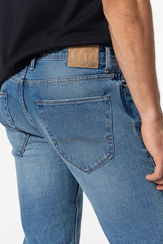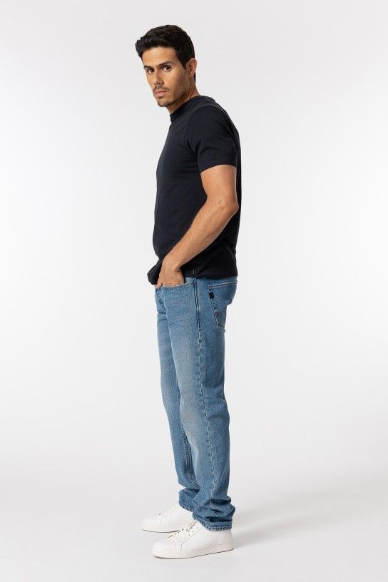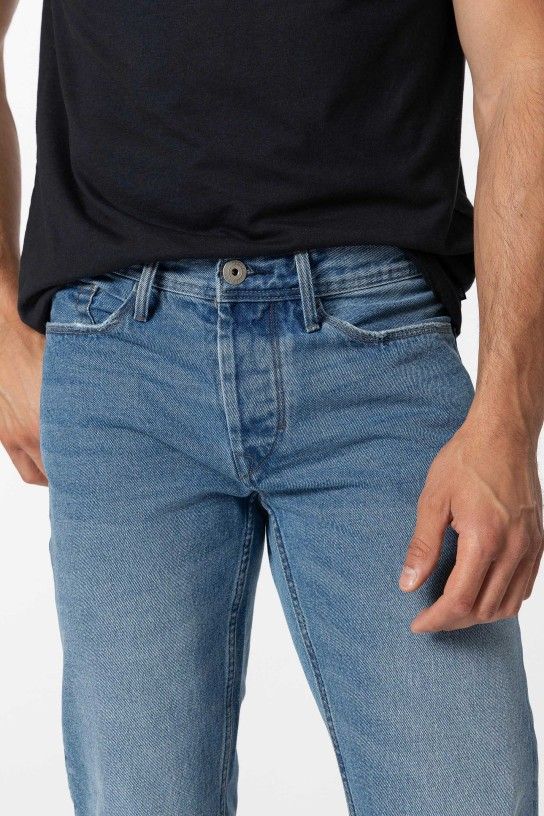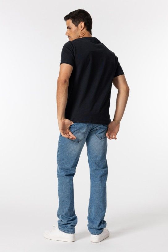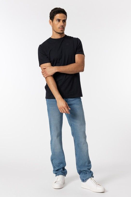 Jeans regular fit com cinco bolsos. Fecho frontal com botões ocultos por carcela e botão metálico.