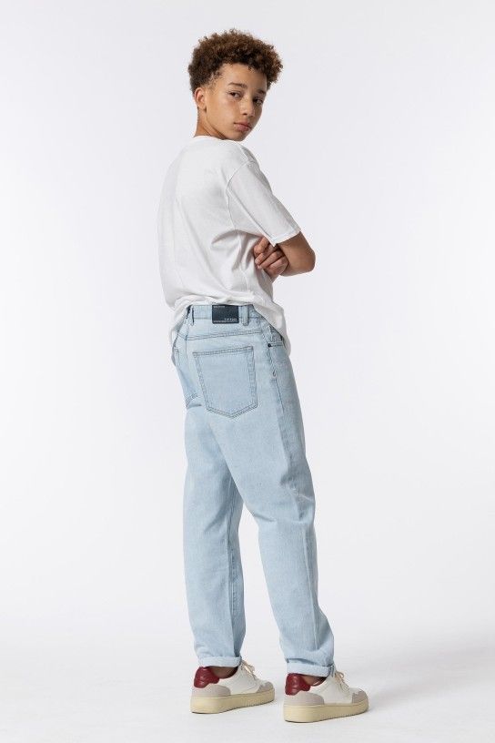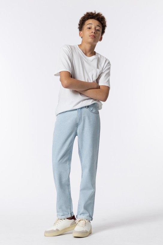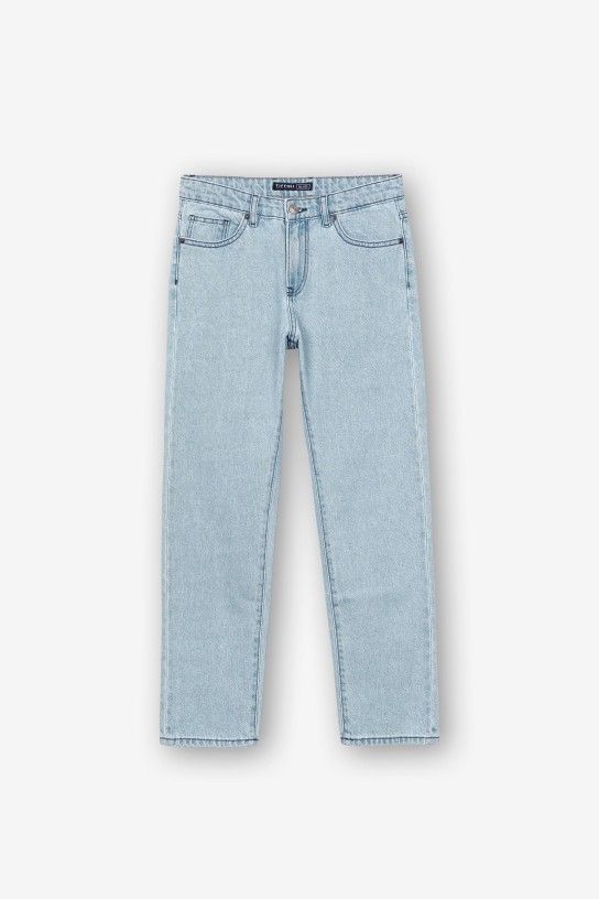 Jeans com cinco bolsos. Fecho frontal de correr com botão metálico.