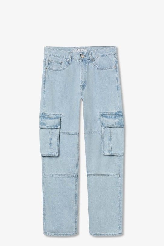 Jeans com perna reta com bolsos à frente e atrás e detalhe de bolso com aba tipo cargo na lateral. Fecho frontal com fecho zip e botão metálico.