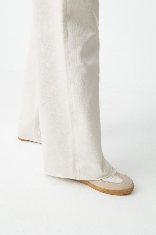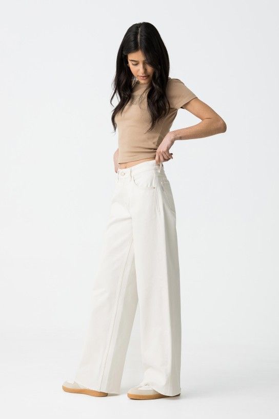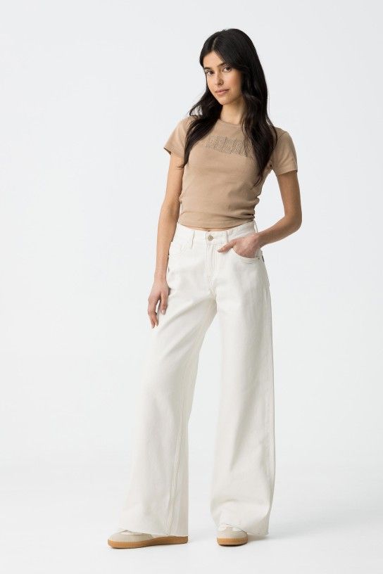Jeans com perna larga de cintura baixa com cinco bolsos. Fecho frontal com fecho zip e botão metálico. Bainha desfiada.