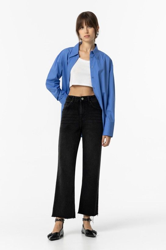 Jeans de cintura alta e perna reta com cinco bolsos. Fecho frontal com fecho de correr e botão metálico. Bainha com acabamento desfiado.