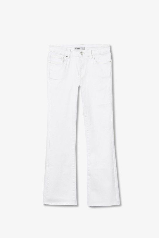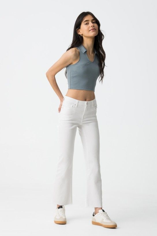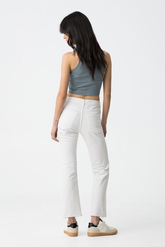 Jeans curtos à boca de sino de cintura média com cinco bolsos. Fecho frontal com fecho zip e botão metálico. Bainha desfiada.
