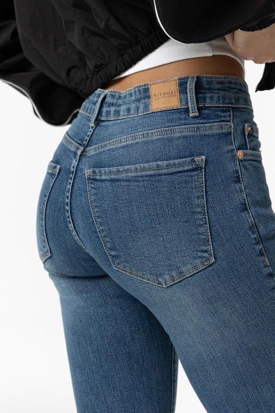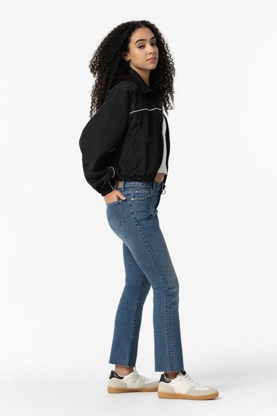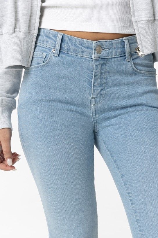 Jeans curtos à boca de sino de cintura média com cinco bolsos. Fecho frontal com fecho zip e botão metálico. Bainha desfiada.