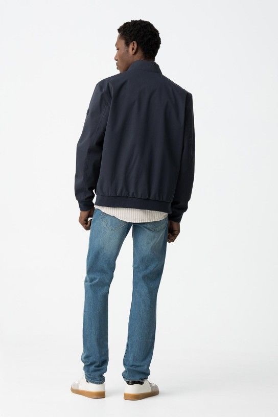 Jeans com cinco bolsos. Fecho frontal com botões ocultos por carcela e botão metálico.