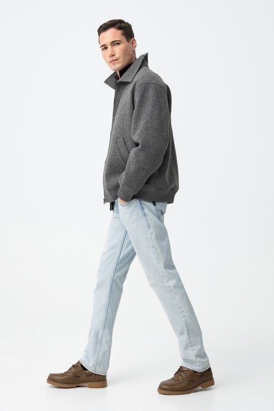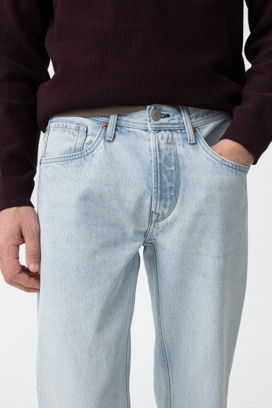Calças de ganga em azul claro, corte regular e comprimento total, com cinco bolsos clássicos.