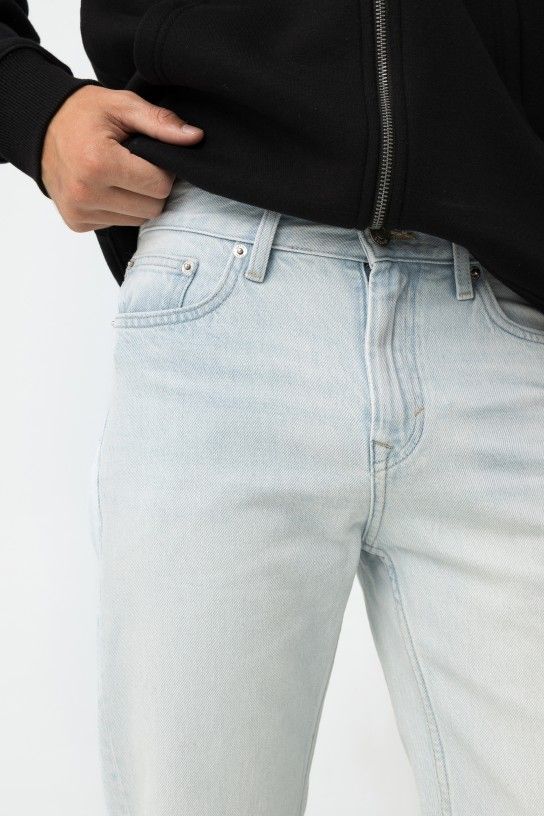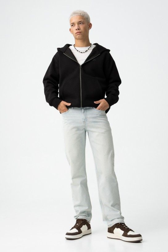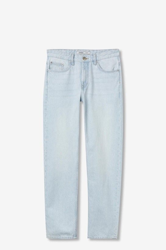 Jeans relaxed fit com cintura média e cinco bolsos. Abertura frontal com fecho de correr e botão metálico.
