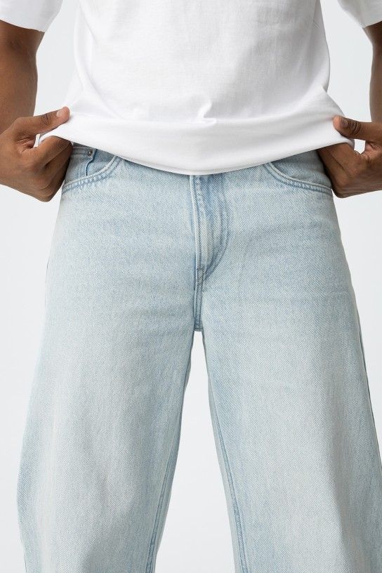 Jeans com perna super baggy, cinco bolsos e abertura frontal com fecho de correr e botão.