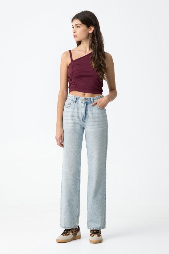 Jeans de cintura alta e perna reta com cinco bolsos. Fecho frontal de correr e botão metálico. Bainha com acabamento desfiado.
