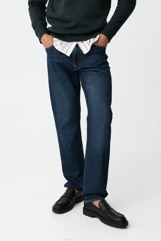 Jeans com cinco bolsos, perna reta e cintura média. Abertura frontal com fecho de correr e botão metálico.