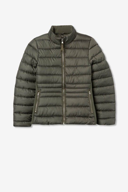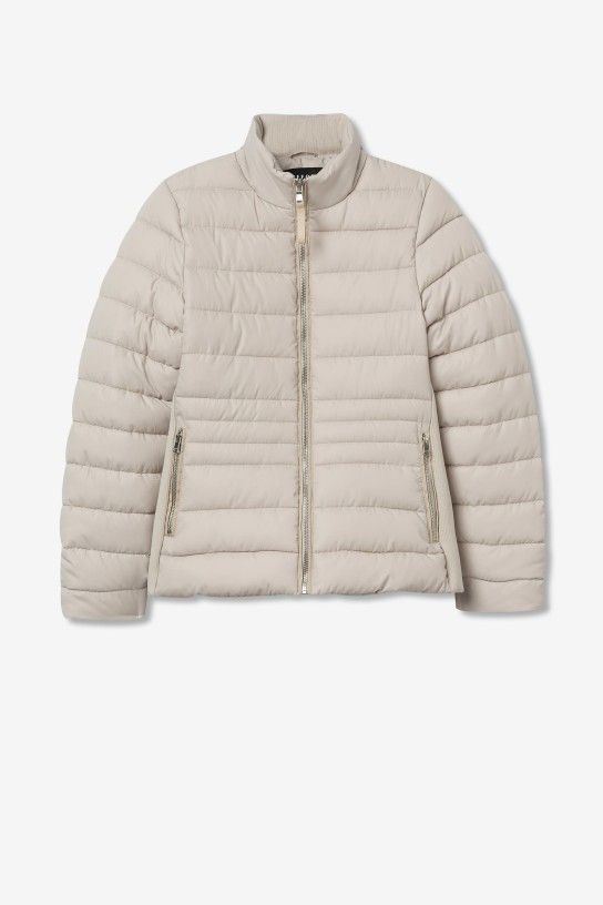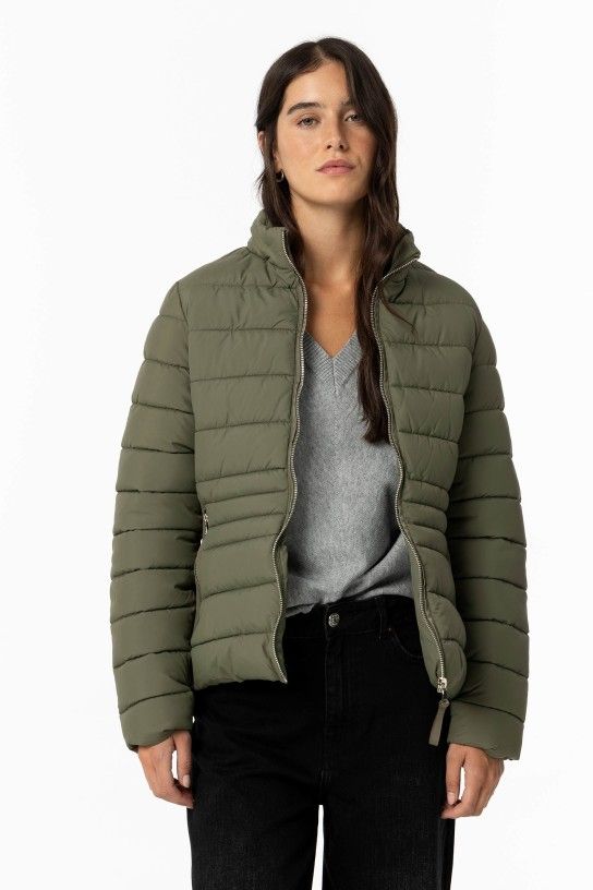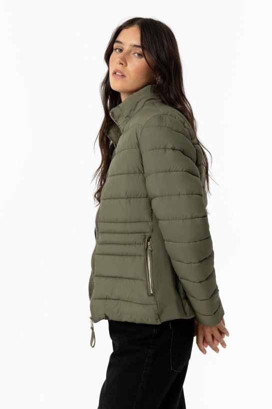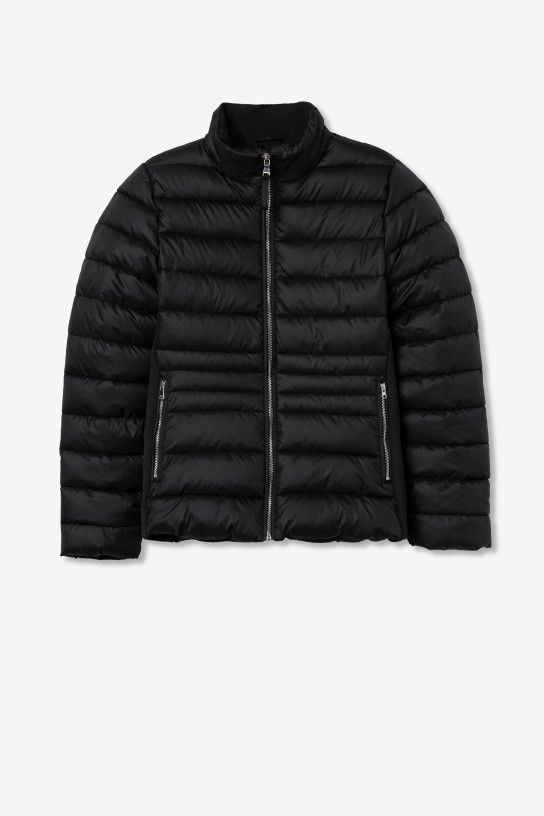 Casaco de gola subida e manga comprida. Bolsos e fecho frontal de correr. Pormenor de elástico nas laterais.