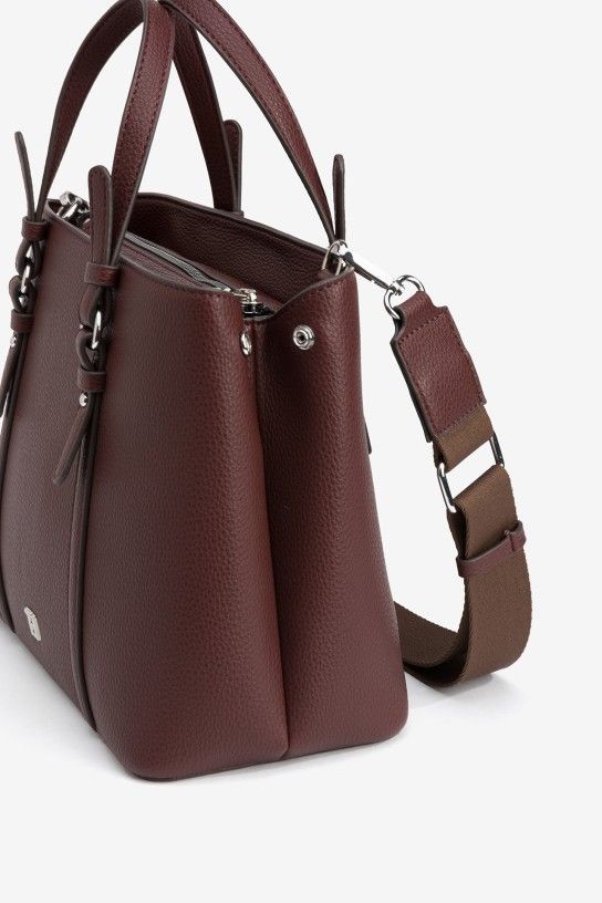 Mala city efeito pele, com fecho de correr superior e alças de mão fixas. Alça tiracolo ajustável e removível. Bolso interno com fecho de correr.