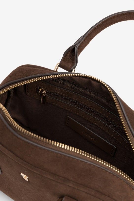 Mala castanha com alças duplas, fecho dourado e bolso interior. Compacta e elegante.