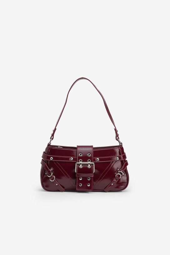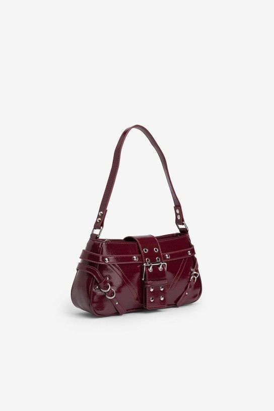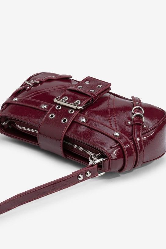 Mala de mão efeito pele envernizada, com aplicações metálicas e pala com fecho magnético. Fecho de correr superior e alça fixa.