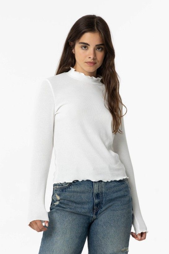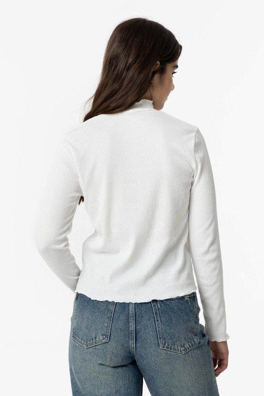 T-shirt de gola perkins e manga comprida. Pormenor de acabamentos com ondas.