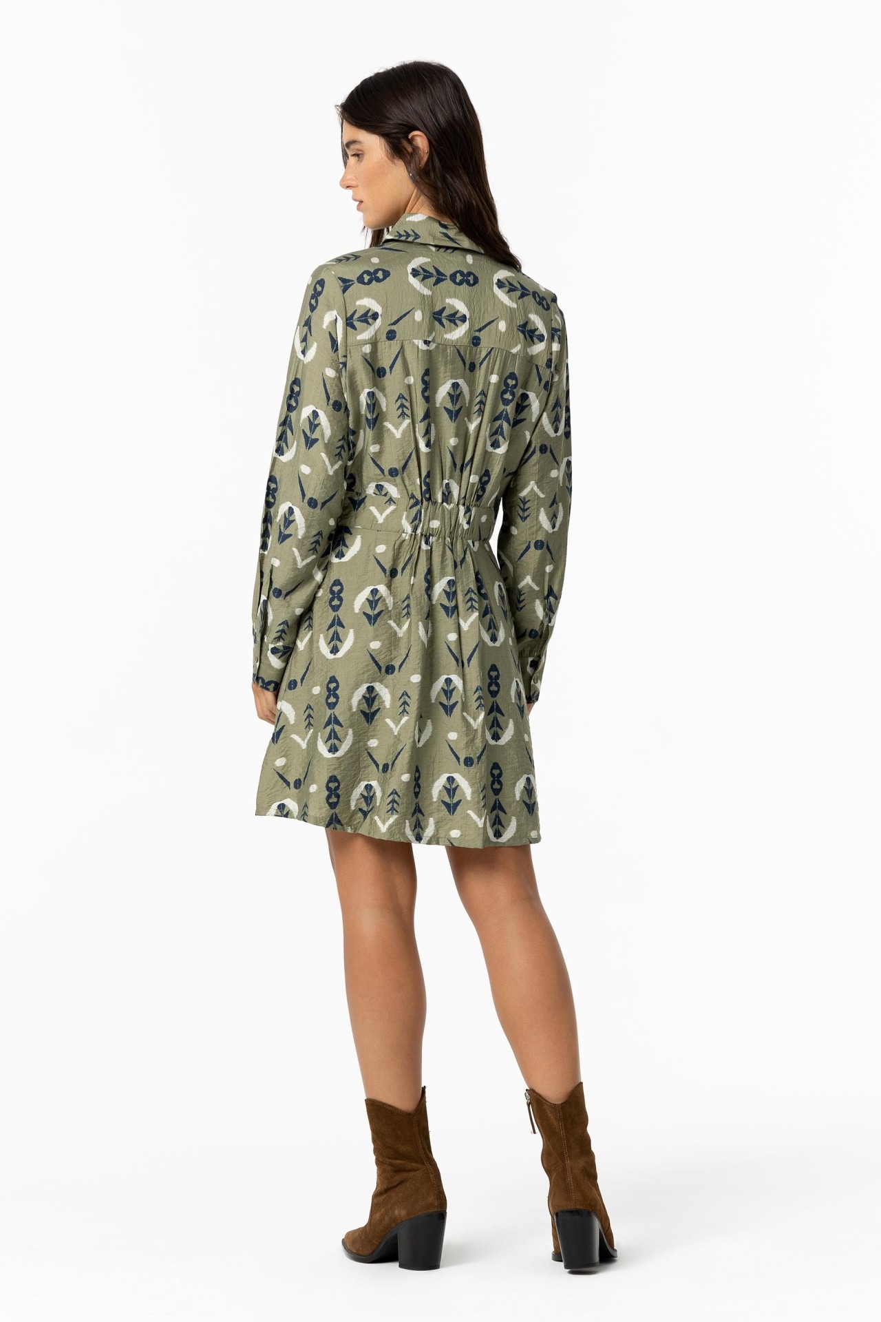 Vestido com colarinho de abas e manga comprida com botão no punho. Bolsos laterais. Fecho à frente com botões.